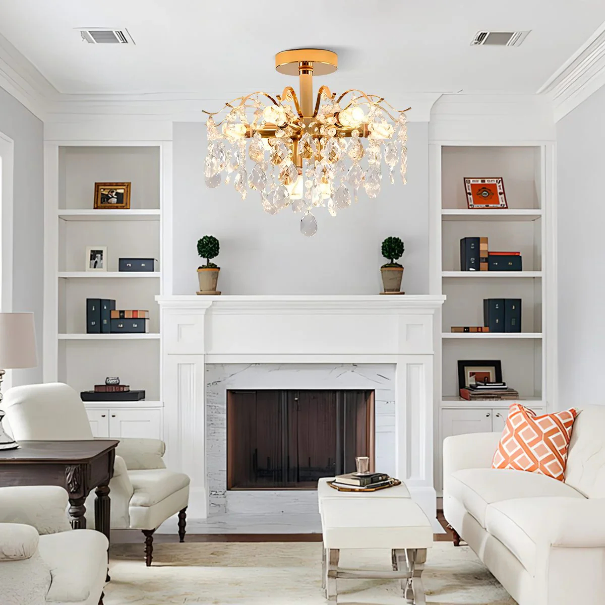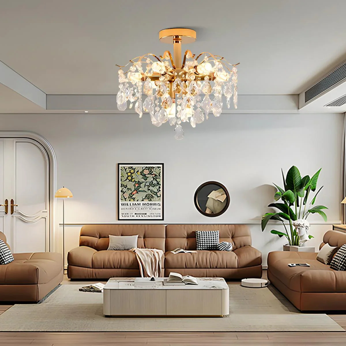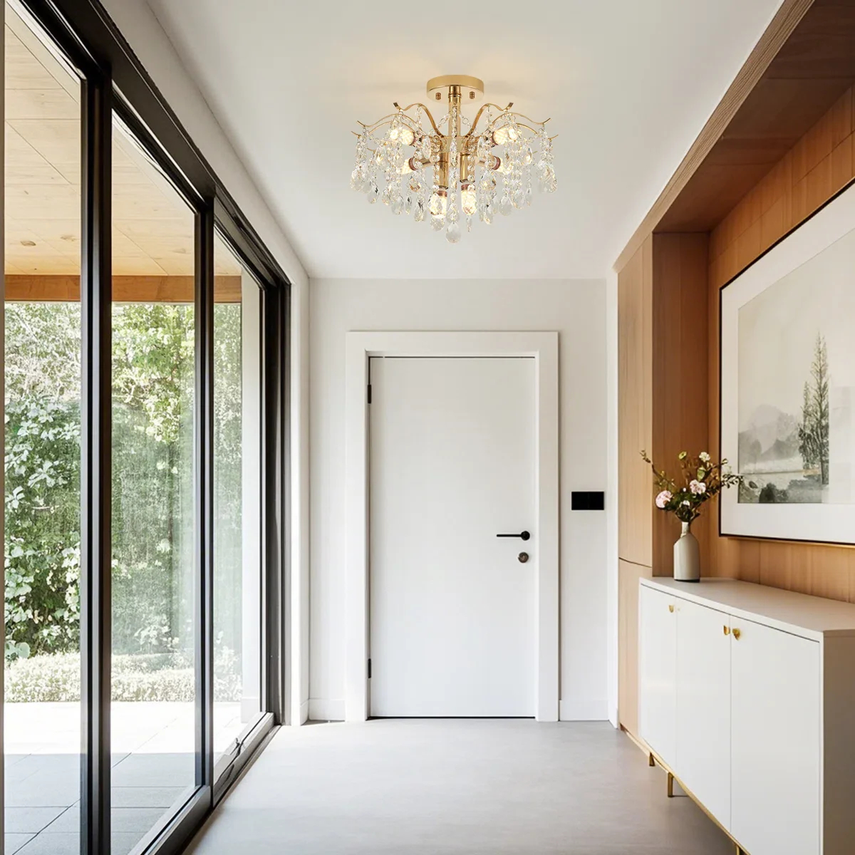 Acest candelabru transforma lumina intr-un element vizual care completeaza atmosfera. Reflexiile discrete create de cristale adauga profunzime si dinamica spatiului, fara a fi excesive.