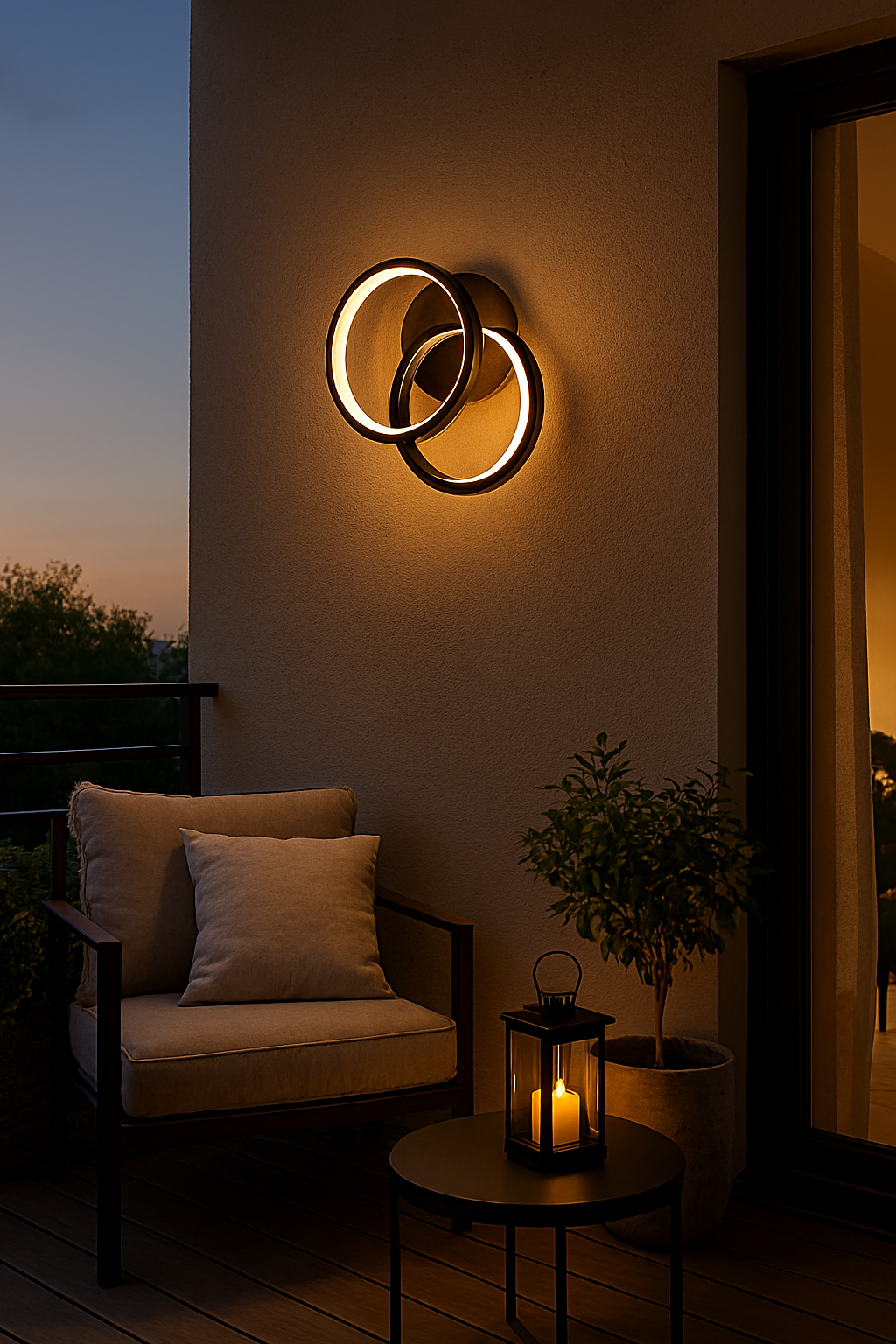 Cele două brațe LED circulare din silicon, susținute de o structură metalică rezistentă, oferă o dispersie uniformă a luminii. Finisajul negru mat adaugă rafinament și stil.